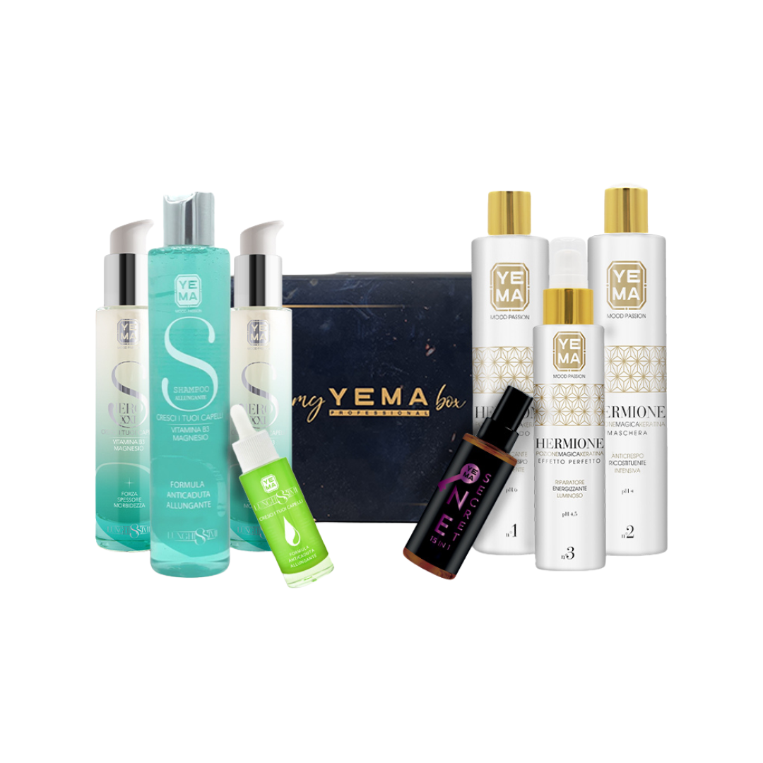 La Black Box Allungante di YEMA, un cofanetto esclusivo pensato per chi desidera capelli lunghi, sani e forti. Al suo interno troverai una selezione dei migliori prodotti della linea YEMA Professional, perfetti per un percorso completo di bellezza e trattamento intensivo dei tuoi capelli. Questa box rappresenta la combinazione ideale di trattamenti alla cheratina, sieri allunganti e formule multifunzione, studiati per garantire risultati visibili fin dalle prime applicazioni.